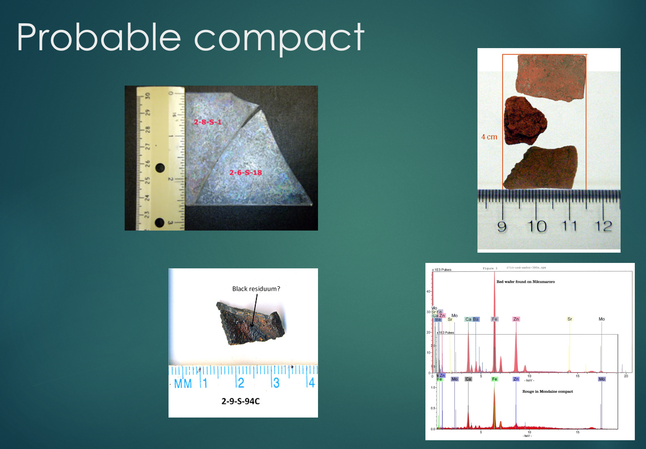 - C. Remnants of an apparent woman’s compact found at the Seven Site on Niku. Chemical analysis (lower right) shows that it consistent with American compacts from the 1930s, of the type used by Amelia Earhart. This is one of many pieces of evidence (but not “smoking gun” proof) that point to Niku as the correct site.