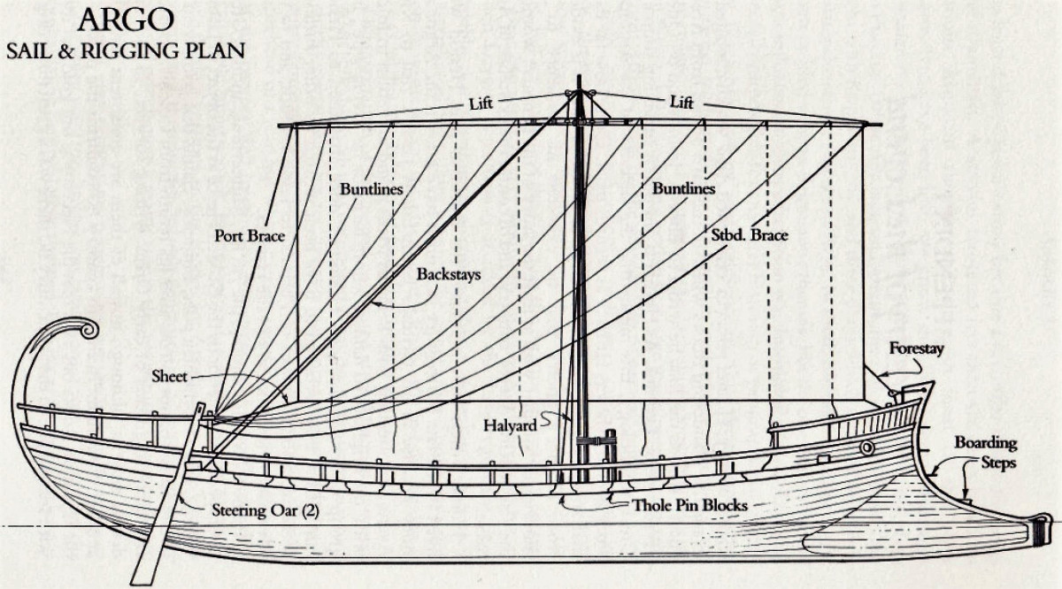 - 4. Sail and rigging plan of Tim Severin’s recreated 54-foot, 20-oar, 22-man Greek vessel Argo