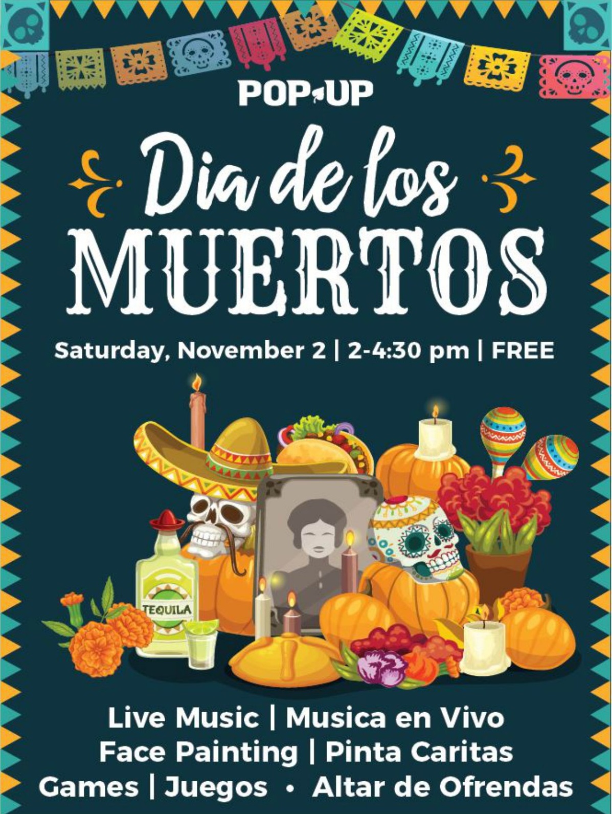 El evento incluirá música de mariachi en vivo del grupo Mariachi Águila DC. Los niños pueden disfrutar de pintarse la cara, colorear su propia máscara o crear una manta tradicional mexicana de papel picado. Se invita a todos a traer artículos para incluir en el Altar de Ofrendas comunal.