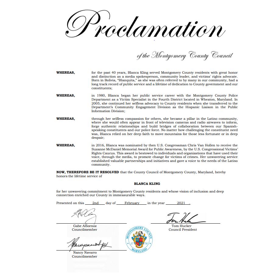 Durante la sesión del Concejo del Condado de Montgomery el martes 2 de febrero, se emitió la Proclamación – “Blanca Kling: Honrando una vida de servicio” por el Presidente del Concejo Tom Hucker, el Vicepresidente del Concejo Gabe Albornoz, la Concejal Nancy Navarro y el Ejecutivo del condado Marc Elrich, en honor a la vida de la portavoz de la Policía del condado de Montgomery quien falleció el miércoles 27 de enero tras batallar contra el virus Covid-19.