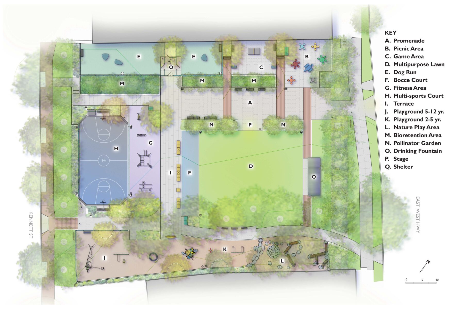Located at 1110 East-West Highway, the park will include a promenade, multi-sports court, picnic area, pollinator garden, stage, shelter, and nature play space.