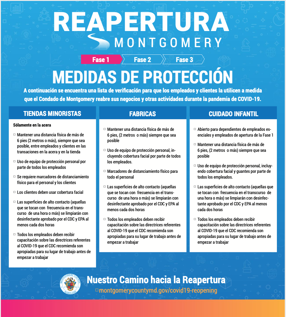 “Estamos evaluando la nueva Orden Ejecutiva del Gobernador Hogan, y estamos en el proceso de determinar si alguna de sus disposiciones de la Fase II funcionará con nuestras políticas y pautas de la Fase I”, dijo Elrich. “Siguiendo las pautas de los CDC y otros expertos en salud pública, cada fase debería tener unos 14 días de mejoras antes de pasar a la siguiente fase”.