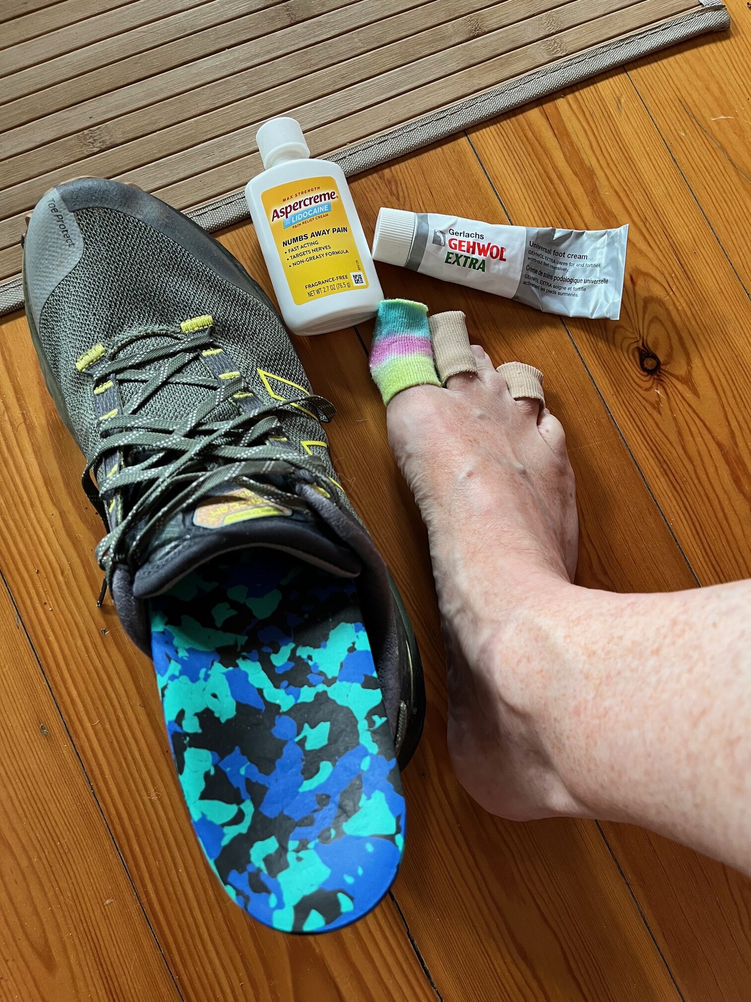 2. My (pretty much) blister- and pain-free feet, thanks to Gel toe caps, an expensive custom orthotic shoe insert, New Balance trail running shoes, and an exotic German foot softening crème. Aspercreme is good for sore ankles, knees and hips. The rainbow-colored toe cap did not work well – it kept slipping off my big toe and creating a lump in the shoe.