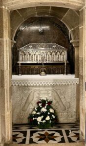 3. This silver relic box in the crypt of the Cathedral of Santiago de Compostela reportedly holds the bones of St. James, one of the twelve disciples of Christ. According to legend he left the Holy Land, preached in northwest Spain, returned to Palestine, and was martyred there in 44 AD. His bones were sailed in a stone boat to Padron (Iria Flavia) in Galicia, Spain, buried, lost, then re-discovered in the 9th century by a hermit following a shower of stars (“Compostela”).