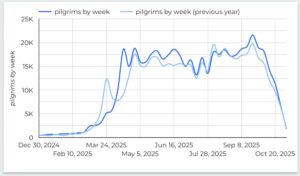 7. Chart showing the most popular months for pilgrims on the Camino, as measured by the number of Compostela certificates issued. Since many pilgrims do not bother to get certificates, the actual numbers are much higher, perhaps by 50 to 100%. The grand total number of pilgrims hiking all the Caminos de Santiago in 2025 is estimated to be about 570,000, a new record, with about 46% of these walking on all or part of the Camino Francés.