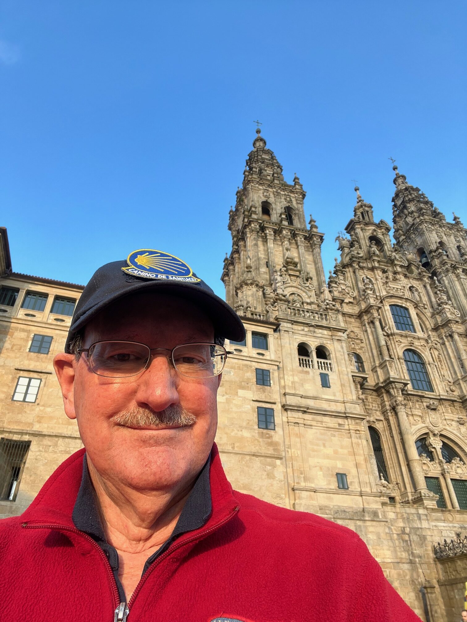 9. Your author at the end of the Camino, in front of the Cathedral of Santiago de Compostela.