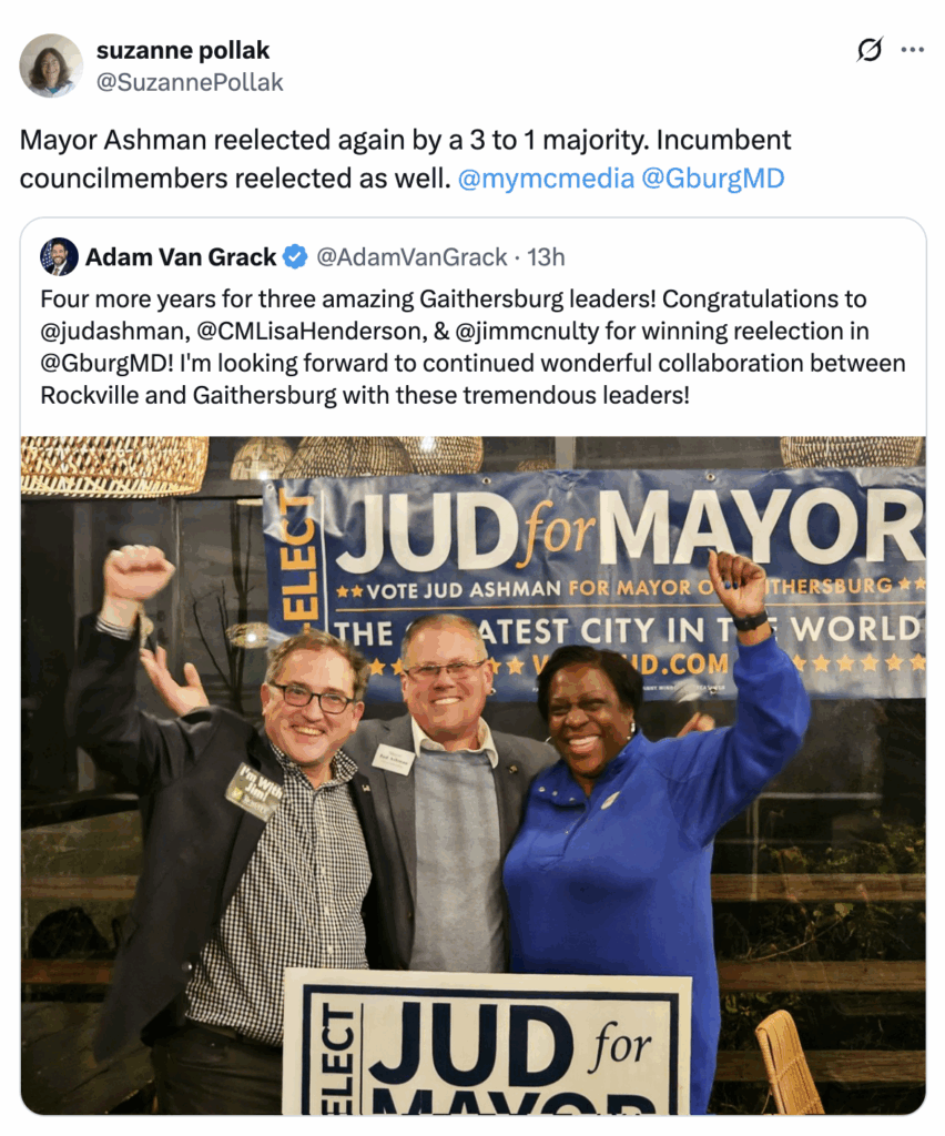 Gaithersburg Mayor Jud Ashman, who is also a member of the Board of Directors at Montgomery Community Media, brought home his fourth consecutive win in the City of Gaithersburg‘s 2025 mayoral race Tuesday, Nov. 4. The unofficial Election Day results posted Tuesday evening on the city’s website. Voters also reelected Councilmembers Jim McNulty and Lisa Henderson.