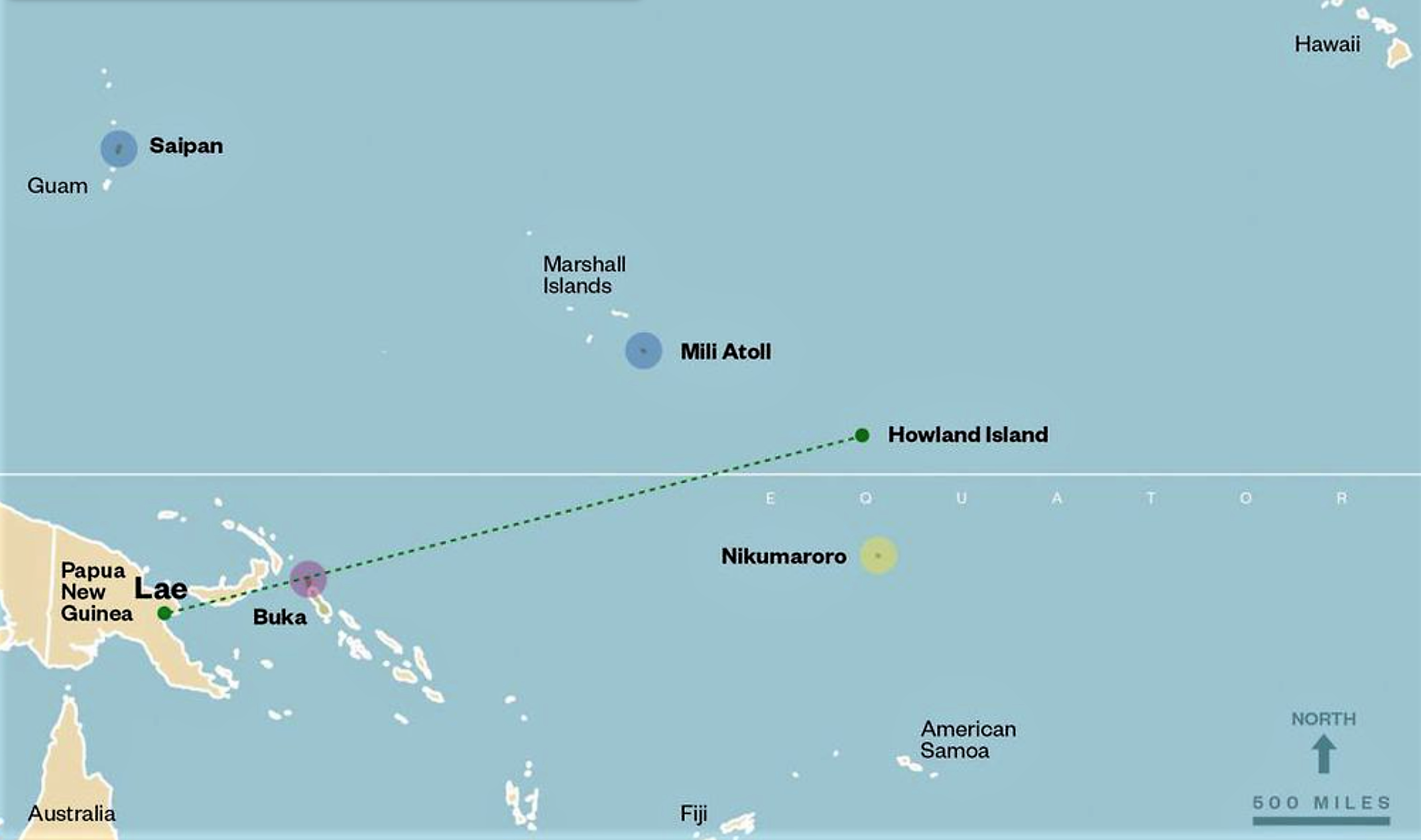 - 2. Map showing the Earhart/Noonan last flight, from Lae, New Guinea to tiny, hard-to- spot Howland Island. The direct distance was 2554 statute miles (2221 nautical miles). Various theories say they ended up in ocean near Howland, in the Marshall Islands, on Gardner Island (now Nikumaroro), or back in New Guinea at Buka.