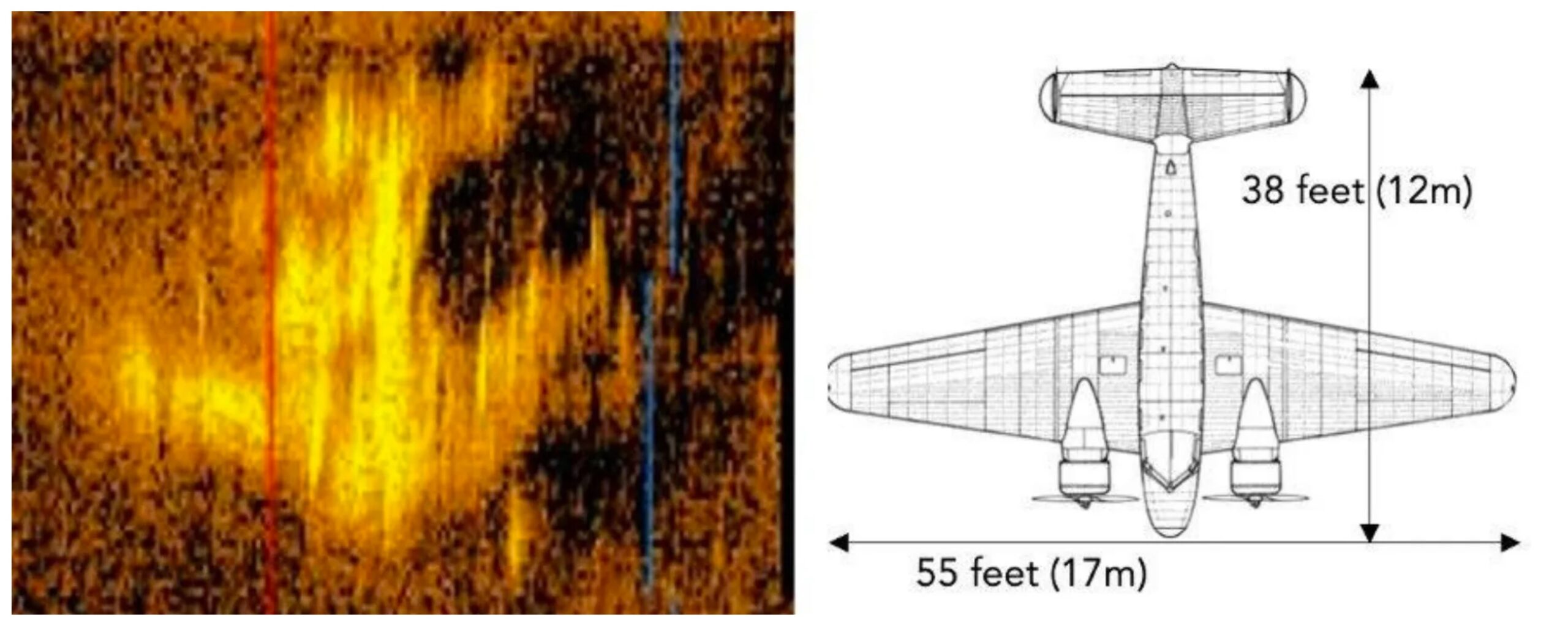 - 3. The original Deep Sea Vision image of the possible Earhart Lockheed Electra, spotted by the DSV team in early 2024 in 16,000 feet of seawater west of Howland. On the right is an overhead plan of the Electra.