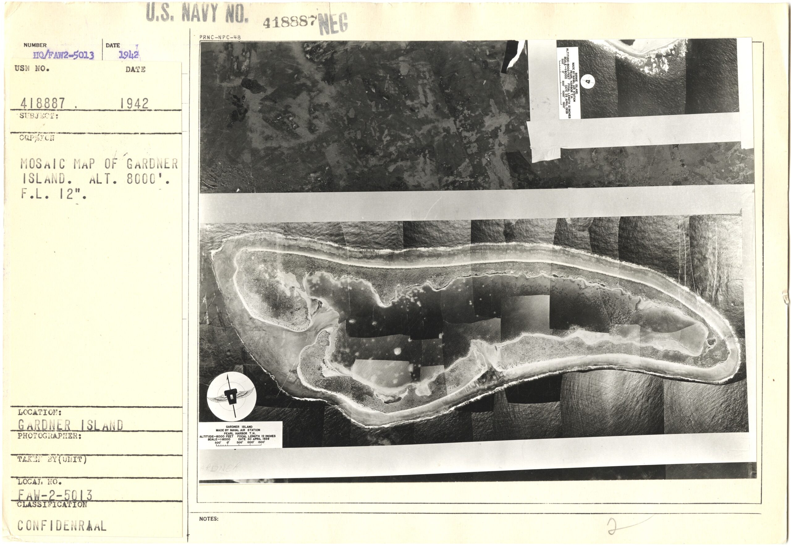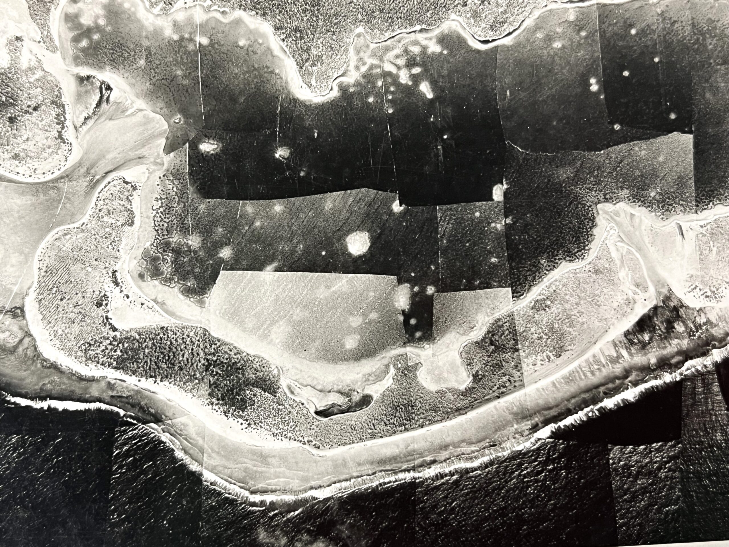 In the photo images section at NA II in Maryland I found a photo of a large photo mosaic that had been compiled from excellent, detailed images of Gardner, taken by a USN seaplane launched by the USS Pelican in 1939. The seaplane flew at 8000 feet and took numerous overlapping 8”x 8” negatives of the island. The negatives were then made into positives, and the positives skillfully cut up to remove the overlaps and create a large photo mosaic.