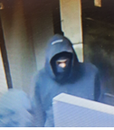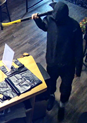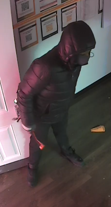 The suspects are described as four men wearing dark clothing and armed with a hammer and a large black axe with a yellow handle. Both the hammer and ax were used to force entry into the businesses.