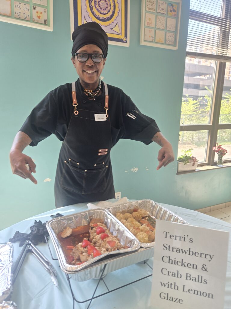 Terri created a strawberry chicken with crab meat entree. She previously had lived in the shelter. Her goal is to work in the kitchen of a shelter and maybe someday set up her own shelter dining facility.