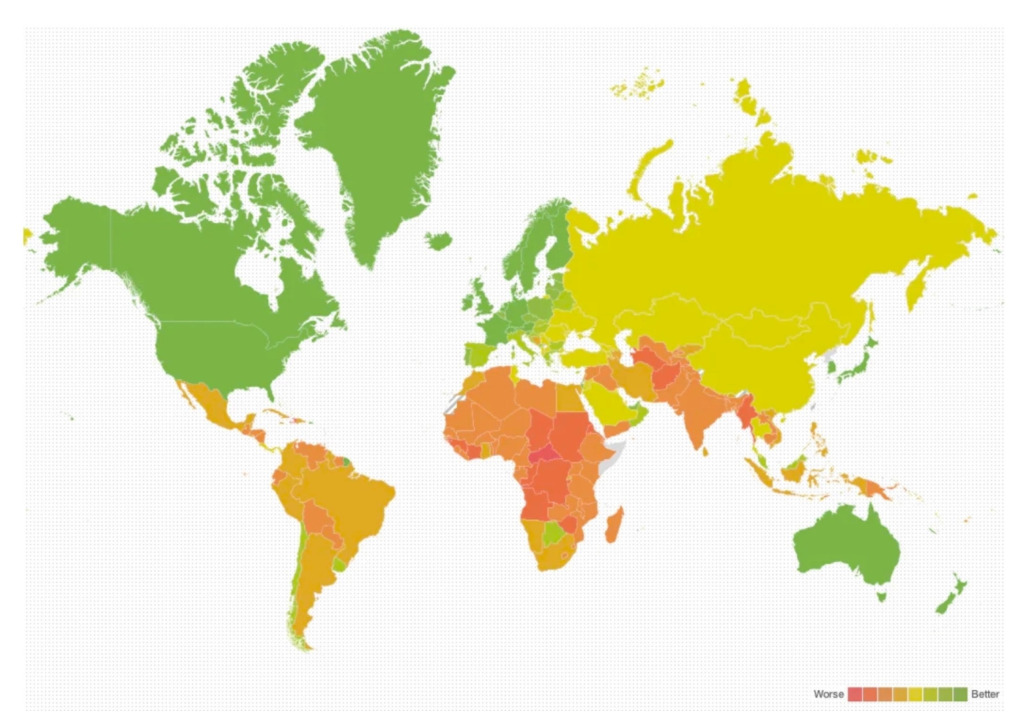 - Map of the world shows countries in green that are ready for climate change, in orange that are less ready, and in red that are unready; from data developed by the Notre Dame Global Adaptation Initiative. The most-ready countries are, in order: Norway, Finland and Switzerland, and the worst-off countries in terms of readiness, from the bottom up, are Chad, the Central African Republic, and Eritrea.