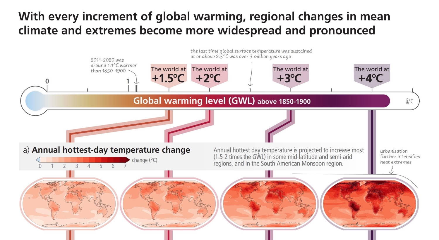 - Image from the recent 2023 Synthesis Report of the UN Intergovernmental Panel on Climate Change, showing that a 3 to 4 degrees Celcius (5.4 to 7.2 degrees Fahrenheit) increase in world mean temperature will mean an increase of 7 degrees C (12.6 F) in hottest day temperatures in many areas (in dark red). Even an increase of only 2 degrees C (3.6 F) will mean substantial increases in the US, Europe, north Africa and Brazil; and this can already be seen in recent heat records in the US and around the globe.
