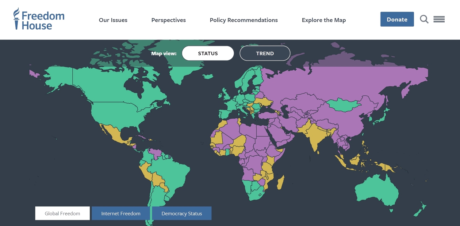 - A map of the world by Freedom House, which analyzes political freedom in each country, including elections, oppression of minorities and corruption. Countries in green are rated as free, with yellow marginal and purple unfree. Some scores: India: 66/100; China: 9/100; Russia: 16/100; and Norway, Sweden and Finland, all 100/100. The USA is a pathetic 83/100, the same as Romania and Panama, and worse than Mongolia (84/100), Canada (98/100), Uruguay (96/100) and Greece (86/100). See: https://freedomhouse.org/explore-the-map?type=fiw&year=2023