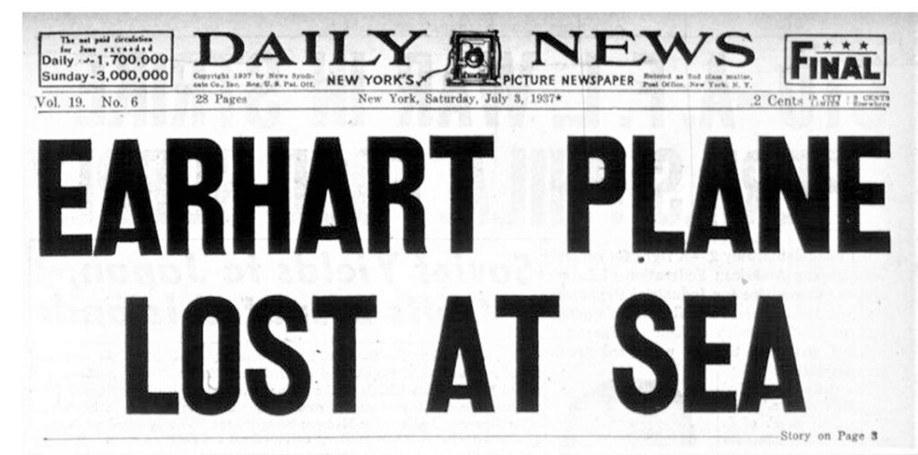 A. Amelia Earhart and navigator Fred Noonan disappeared on July 2, 1937, somewhere in the north or south Pacific. The mystery generated headlines all around the world.