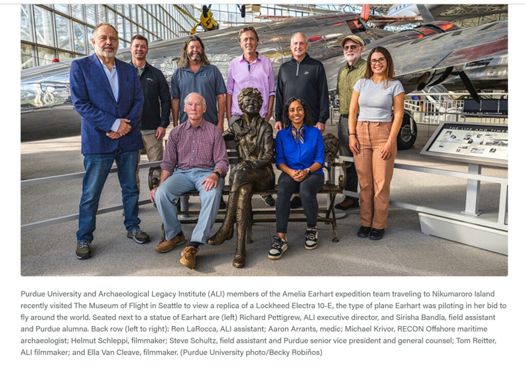 B. A team from Purdue University’s Research Foundation assembled at the Seattle Museum of Flight in September 2025 to help launch the effort to examine Taraia Point in the Gardner/Nikumaroro lagoon, in hopes of finding the Earhart Electra. Note the statue of Amelia.