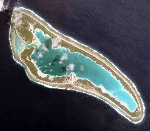 C. A satellite photo of Nikumaroro. Taraia Point is in the north part of the lagoon, pointing downward, opposite and due east of the lagoon entrance on the upper left.