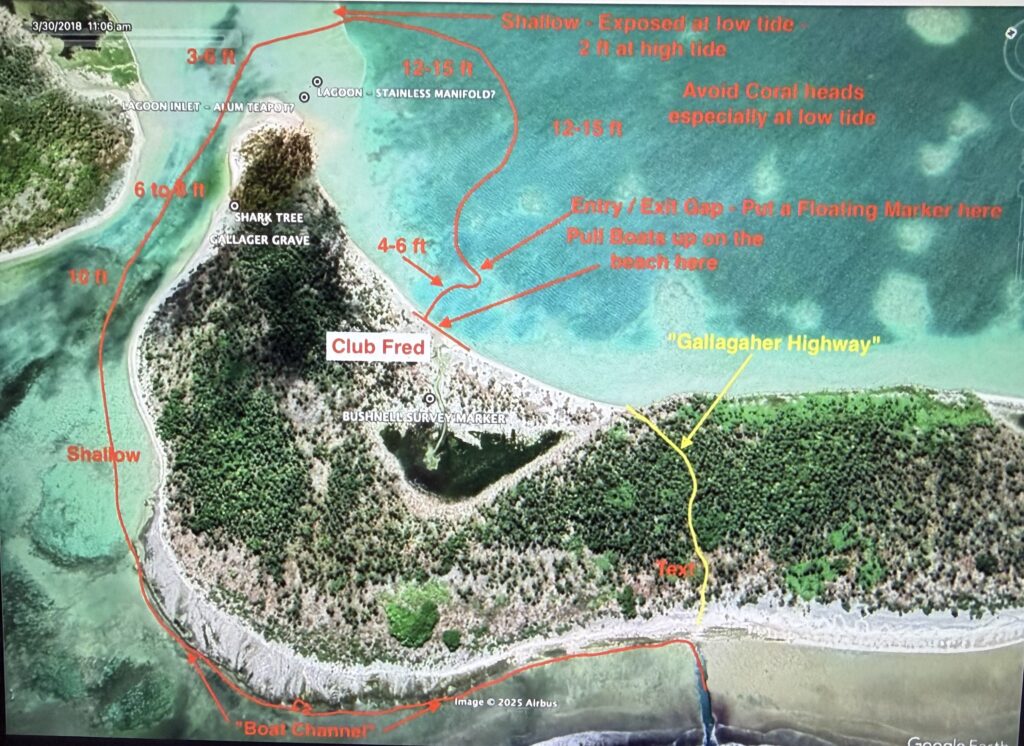E. Getting into the Niku lagoon is quite difficult. Zodiacs must enter the dangerous sharp-coral channel at the bottom of the photo, go west, then north, across the shallow entrance channel at high tide, and loop around to Club Fred. The next morning the team enters the channel, beaches, re-cuts the “Gallagher Highway” through the jungle to the lagoon, gets in the Zodiacs, then heads to Taraia Point to begin the real work.