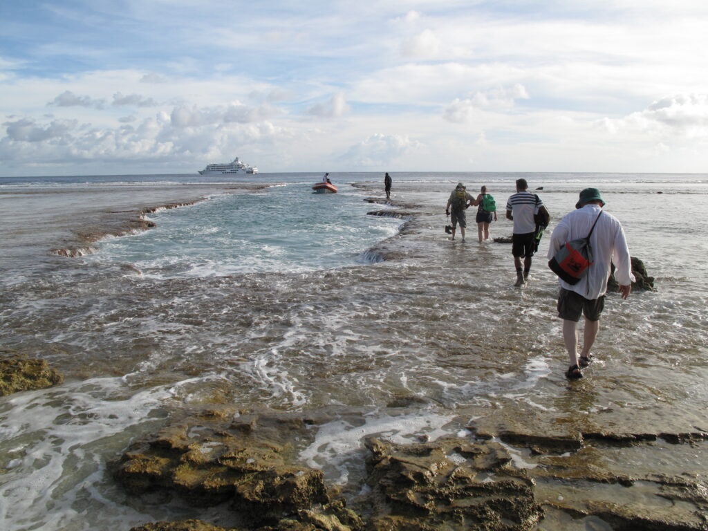 F. The 2017 TIGHAR expedition team to Niku heads back to their large ship, waiting in the swells off the island. The slippery, sharp coral channel is calm here but is quite dangerous in heavy seas.