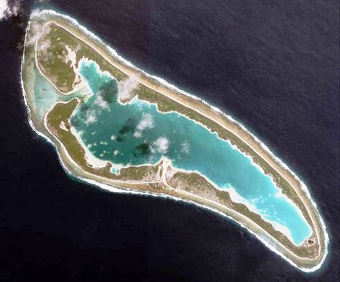 C. A satellite photo of Nikumaroro. Taraia Point is in the north part of the lagoon, pointing downward, opposite and due east of the lagoon entrance on the upper left.